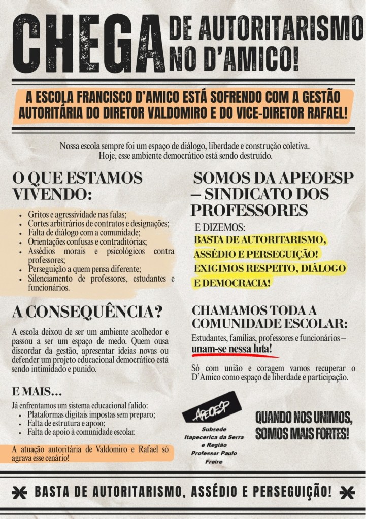 Após um longo histórico de autoritarismo e assédio moral sobre professores, funcionários, estudantes e familiares da Escola Estadual Francisco D’Amico, o diretor Valdomiro, e seu vice, Rafael, no dia 21/7/2025, comunicaram de forma intempestiva a extinção dos contratos de um professor e uma professora contratados categoria O, com base em acusações mentirosas e sem nenhuma prova contra eles. O único “crime” que cometeram foi enfrentar as atitudes autoritárias destes gestores.